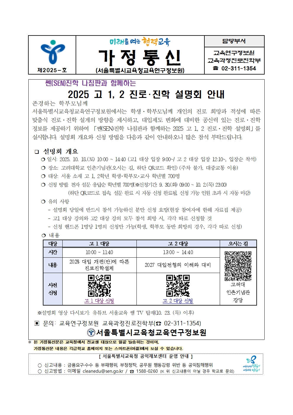 (교육청) 2025 고 1, 2 진로・진학 설명회 안내