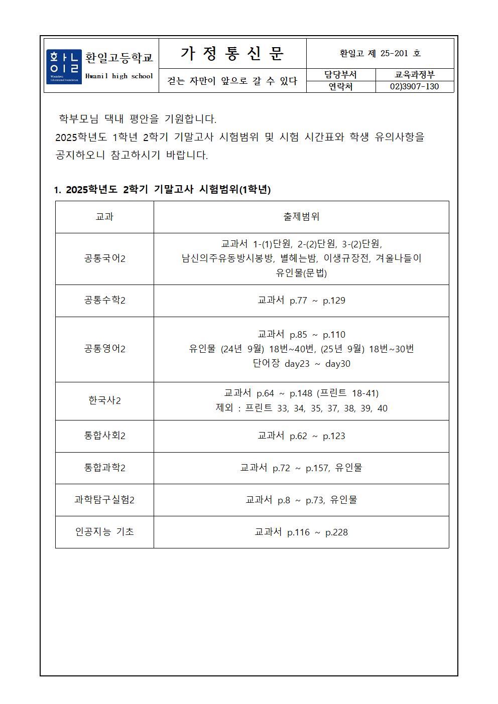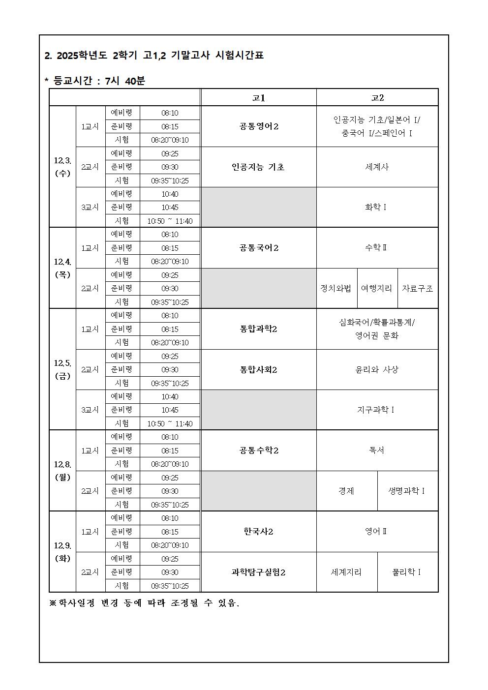 2025학년도 2학기 고1 기말고사 안내
